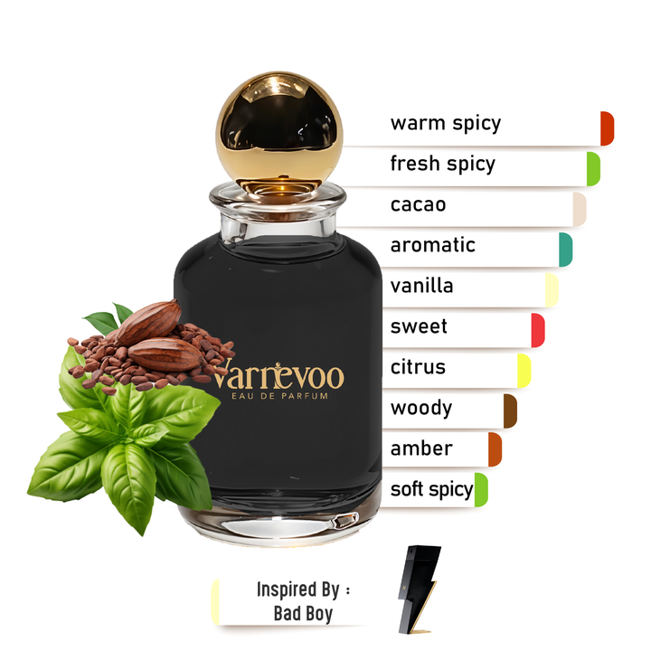 Bad Aura reinterprets Bad Boy as a bold, magnetic scent. It begins with spicy pepper and citrus zing, softens into warm cedar-sage heart, and settles into a seductive duo of tonka and cocoa—made for confident nights and unforgettable presence.